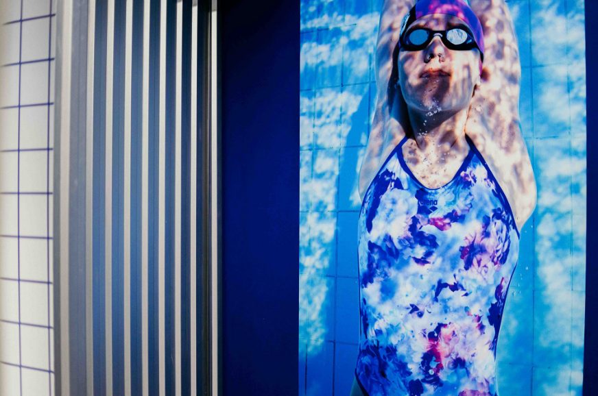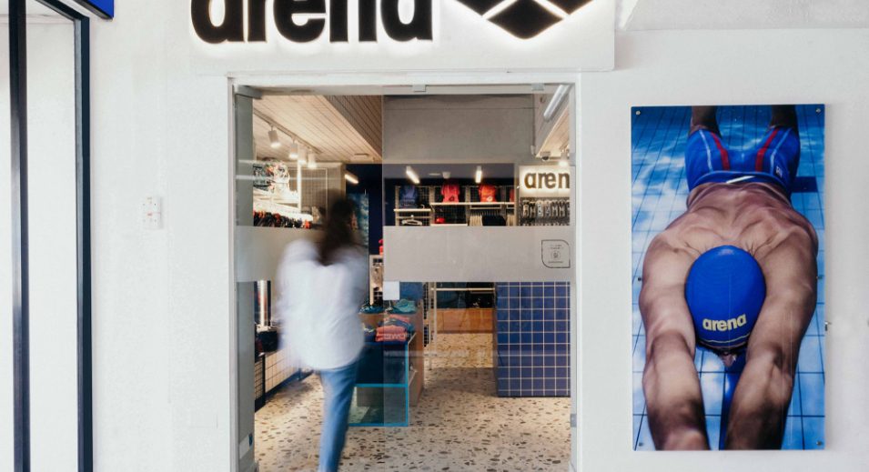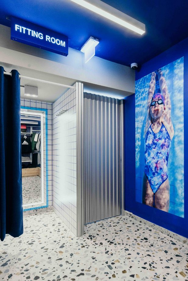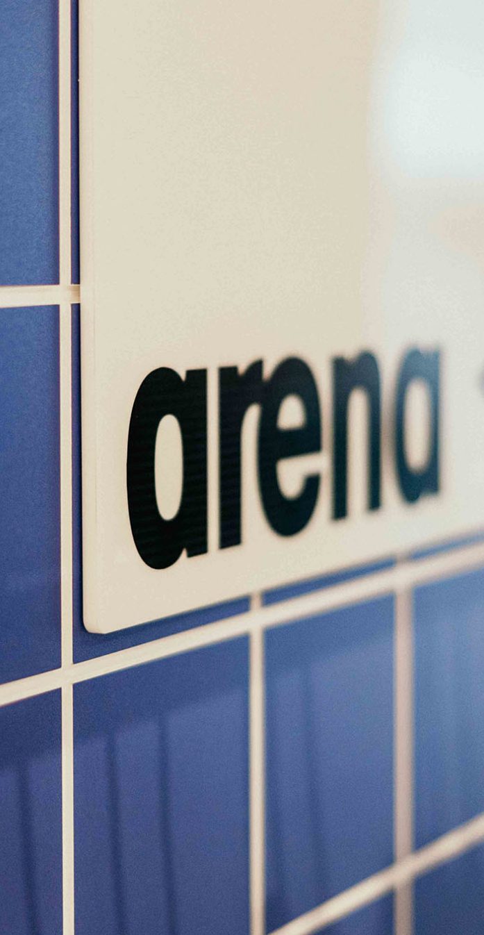 A prominent #backtowater sign is displayed within the shop, reinforcing Arena’s latest marketing campaign. The strategic use of blue hues and varied lighting techniques further enhances the space, creating an immersive sensory experience that captures the essence of swimming.