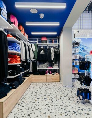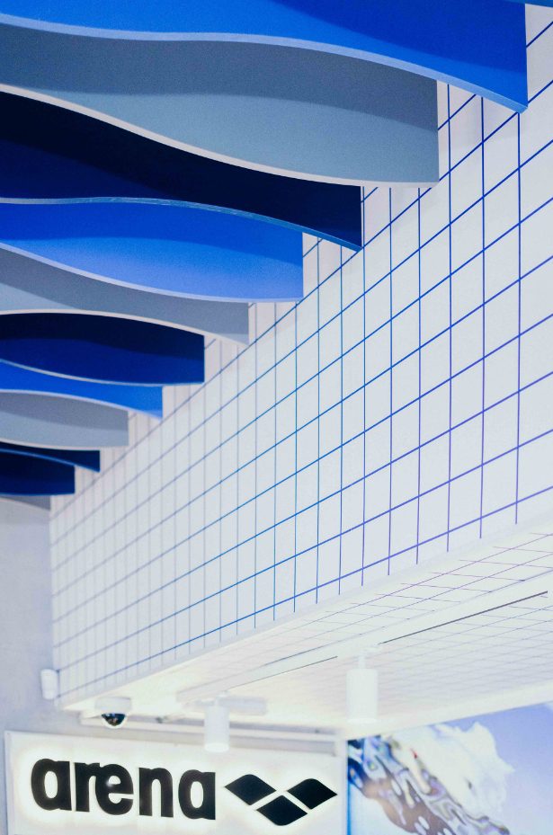The newly designed Arena shop at the National Pool of Malta is crafted to immerse customers in the world of swimming. The ceiling features a striking wave-inspired design, while wooden partitions mimic poolside aesthetics, setting the shop apart from standard retail spaces.