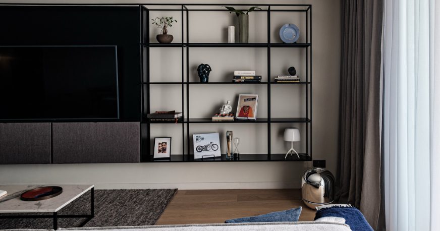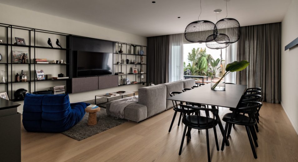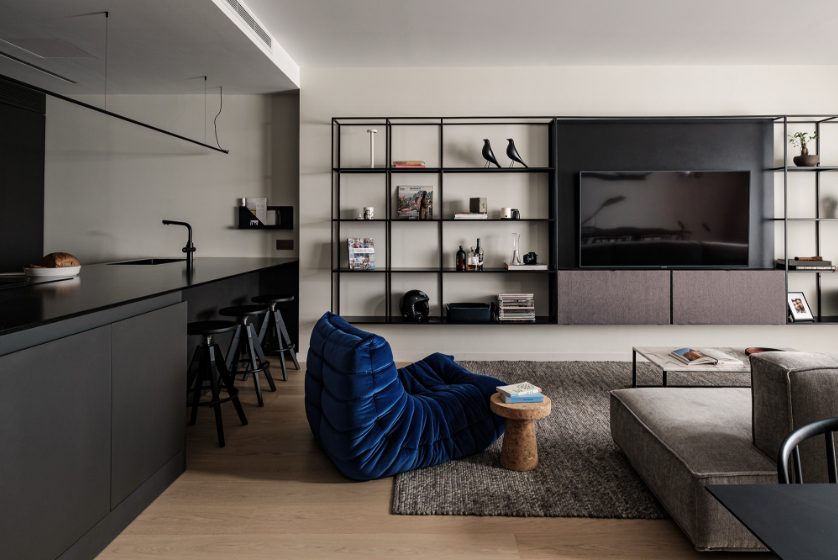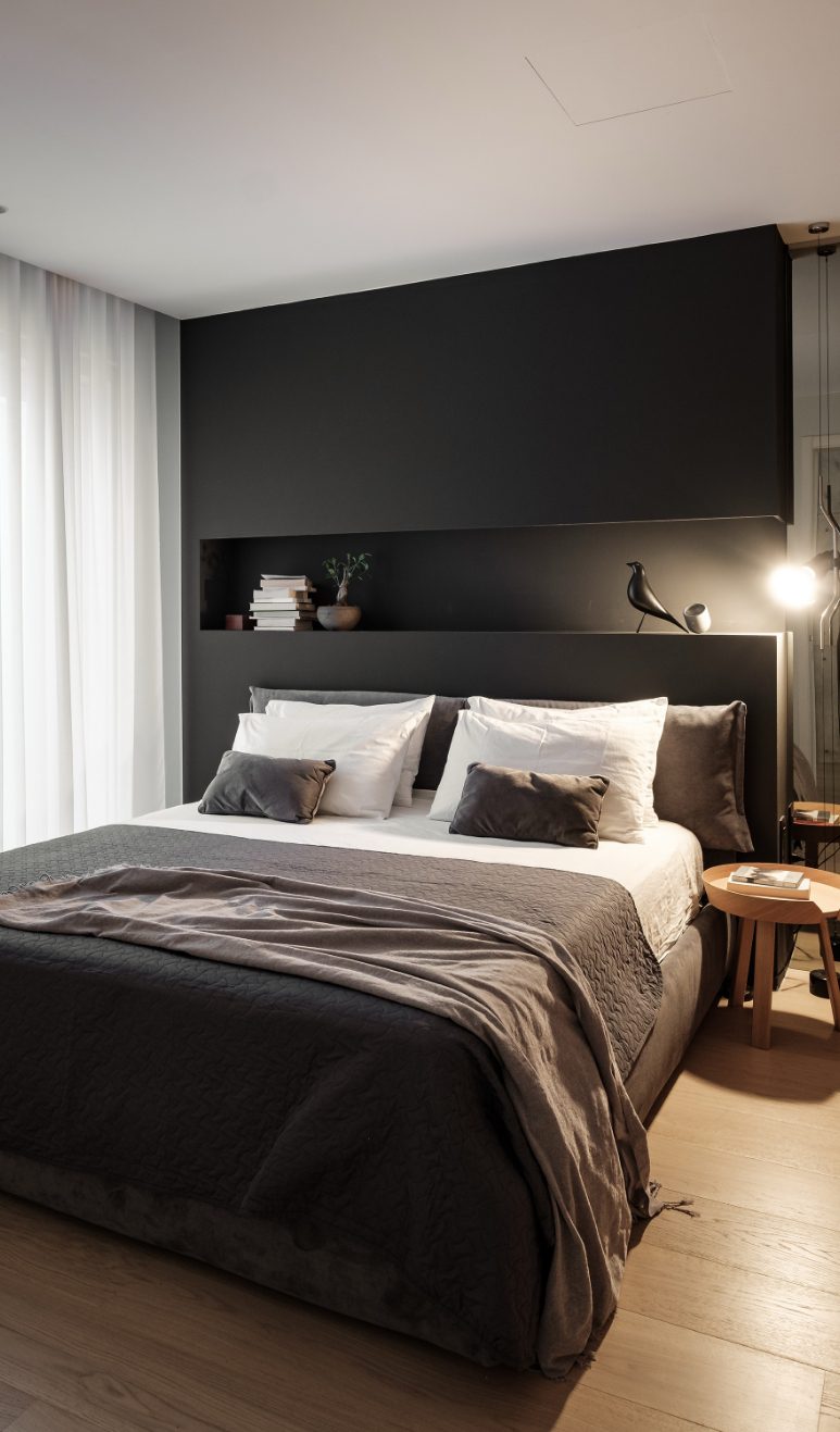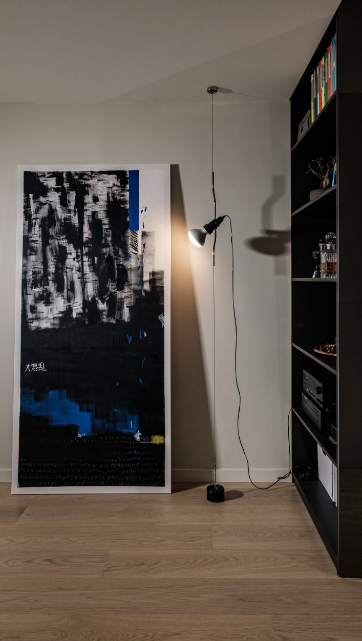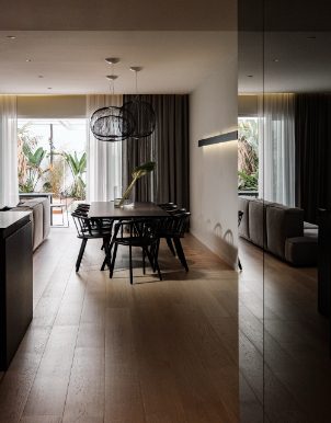 A meticulously chosen color palette defines the home’s sophisticated atmosphere. Furniture and accessories are predominantly in deep black and dark grey hues, creating a striking yet harmonious contrast against the soft, toasted almond white walls. Custom-built wall cladding and fitted units further enhance the sense of calm and balance, offering a refined and timeless living environment that exudes elegance, serenity, and purpose.