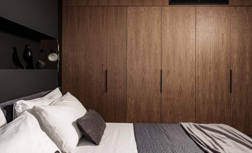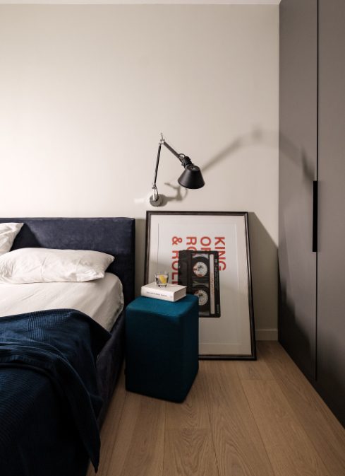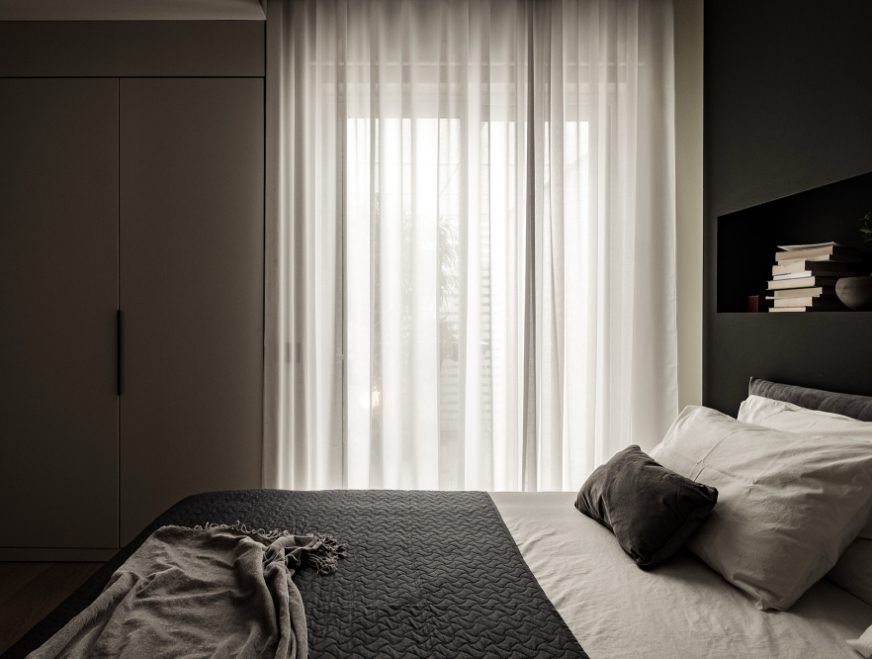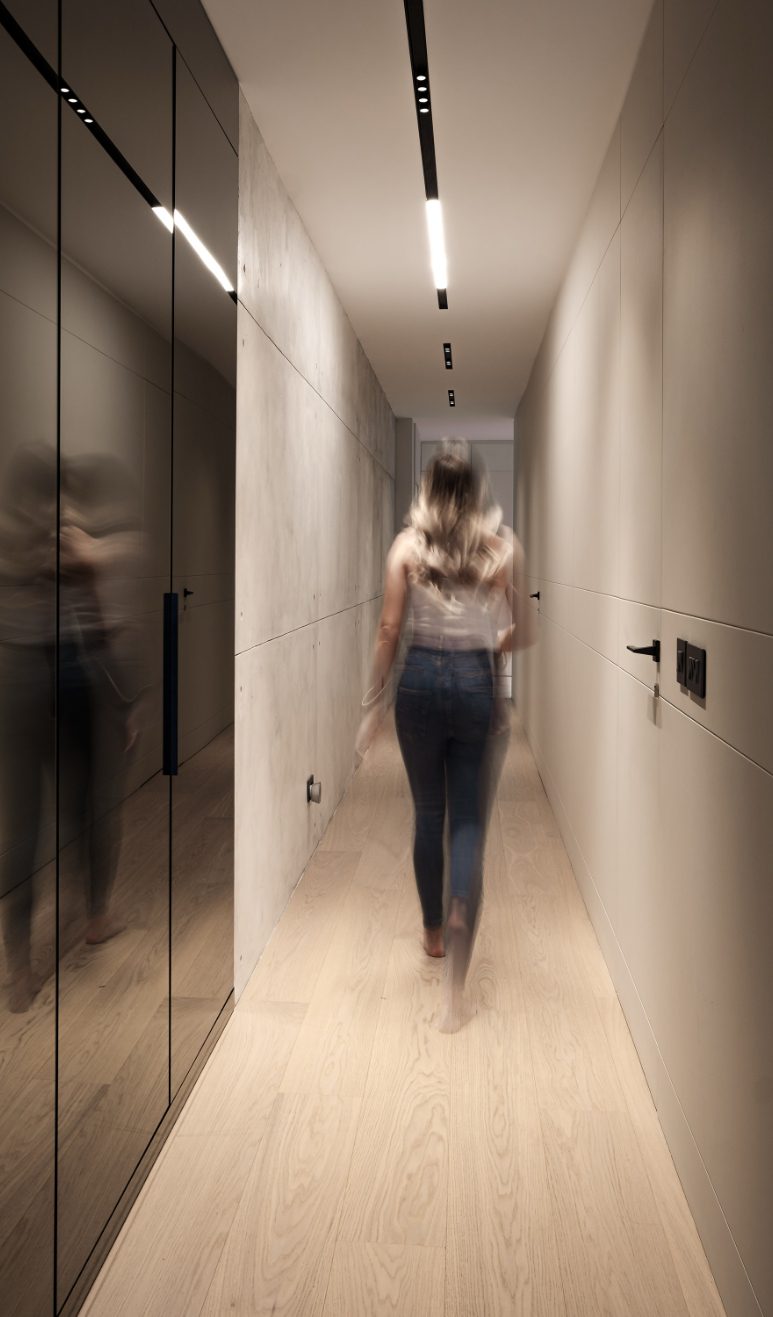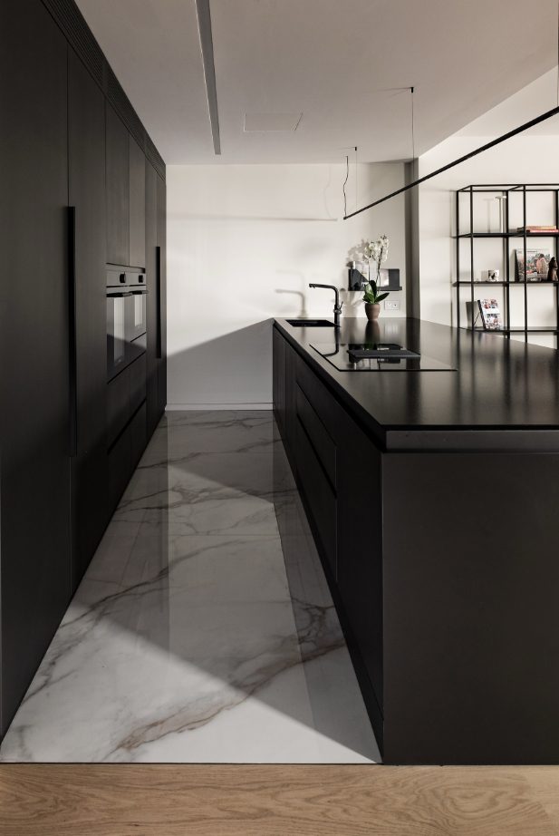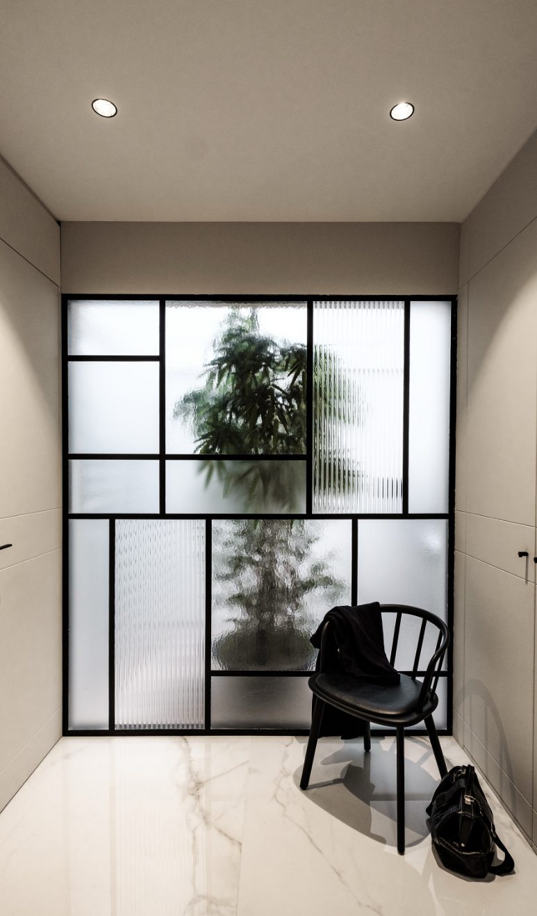 A meticulously chosen color palette defines the home’s sophisticated atmosphere. Furniture and accessories are predominantly in deep black and dark grey hues, creating a striking yet harmonious contrast against the soft, toasted almond white walls. Custom-built wall cladding and fitted units further enhance the sense of calm and balance, offering a refined and timeless living environment that exudes elegance, serenity, and purpose.