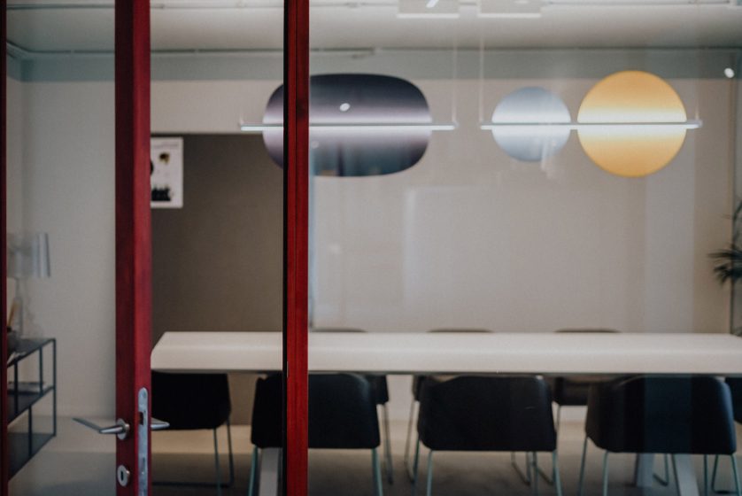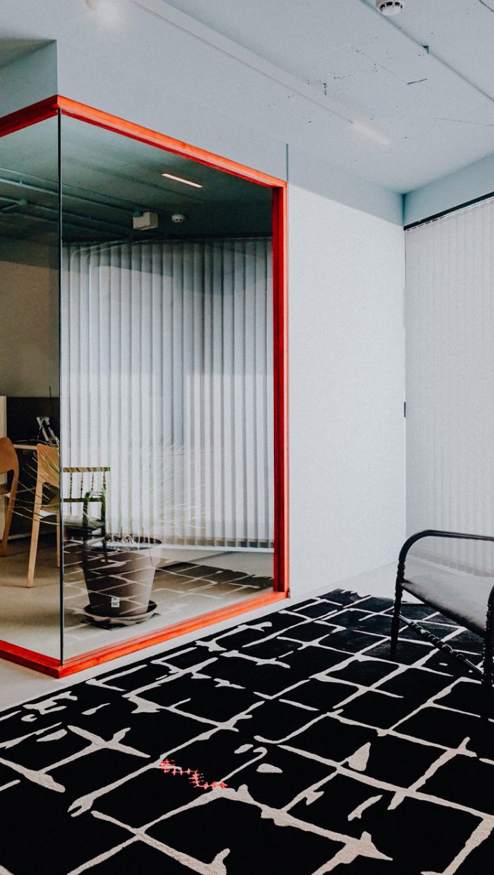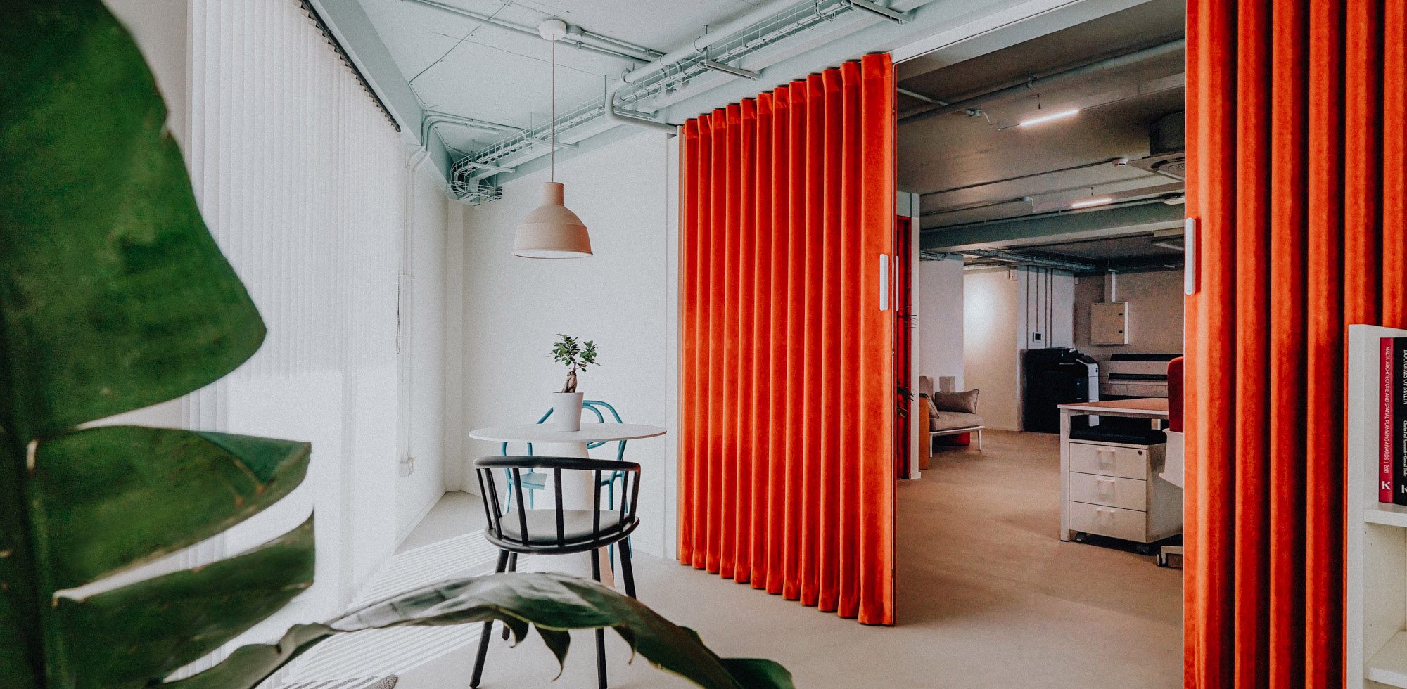 Adding to the visual excitement, red stained glass partitions and bright orange fabric dividers inject playful pops of color throughout the space. Greenery is thoughtfully integrated to balance the vivid interior with the surrounding urban landscape, promoting a sense of tranquility. The use of resin flooring throughout both office floors ensures a seamless and flowing effect, complementing the overall cohesion and fluidity of the design.