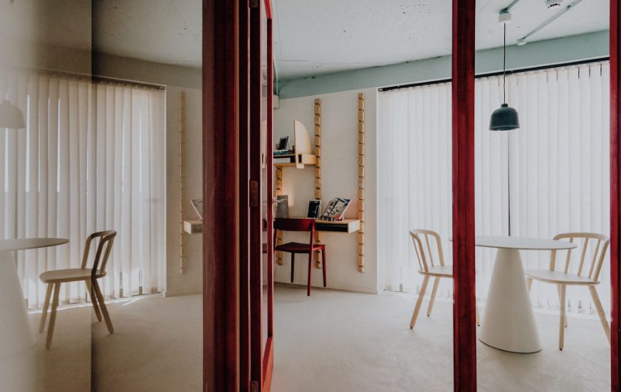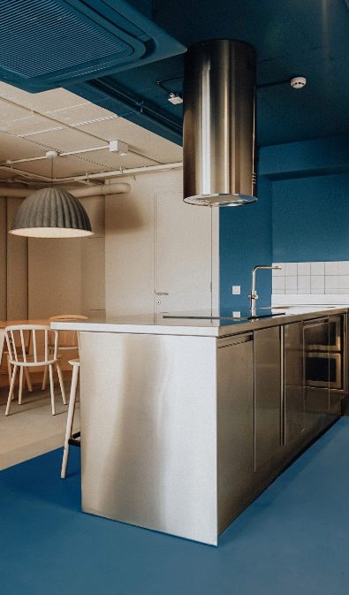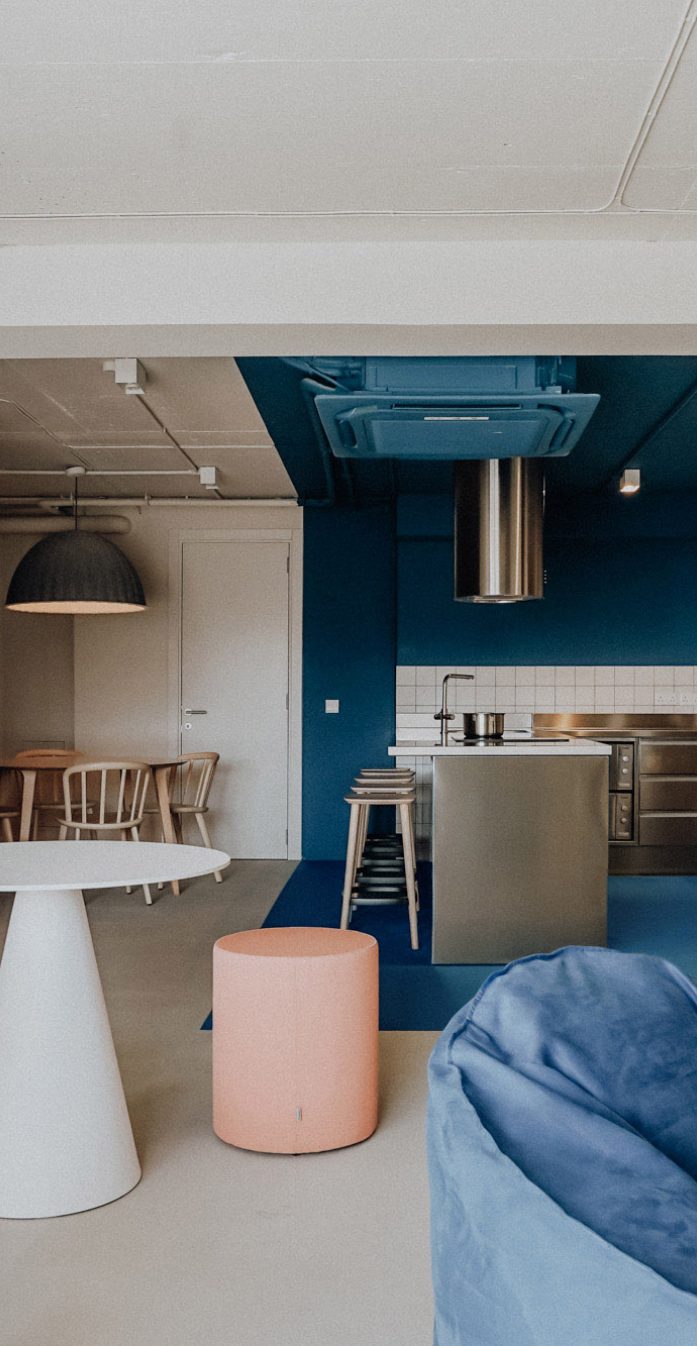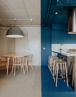 The new DAAA Haus offices at Park Heights span two levels, featuring bright and colorful interiors that invigorate the workspace. Light blue ceilings provide a soothing overhead contrast to the vibrant elements below. The kitchen stands out with its striking Yves Klein blue framing and stainless steel industrial setup, creating a bold and functional centrepiece. Plywood and white shelving provide a harmonious blend of natural and modern materials, ensuring utility and aesthetic appeal equally.