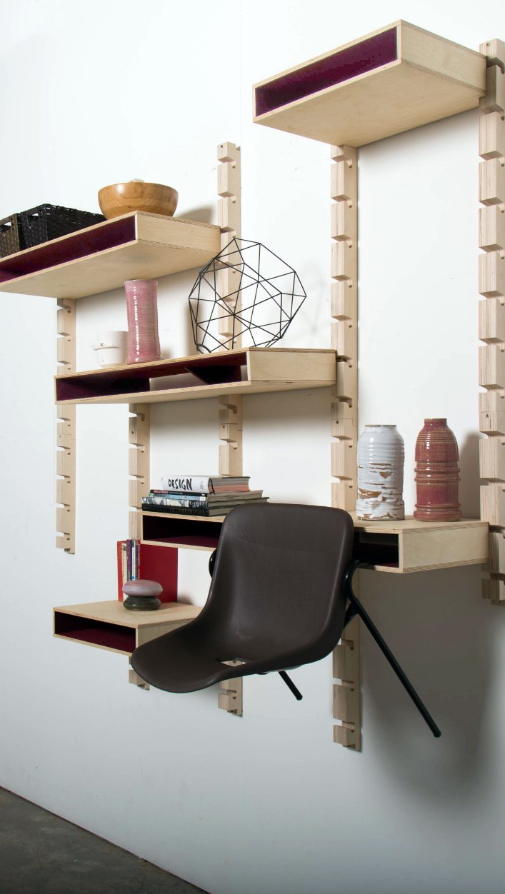 Designed and inspired by the 1980s modular shop shelving system, Dendel is a modular system offering flexibility for storage of books and furniture, whilst also serving as a stand-alone furniture feature. ‘Dendel’ is complete wall mounted leaving the floor completely clear. Providing a dynamic yet subtle design allowing you to add to its structural format in ways that you choose.