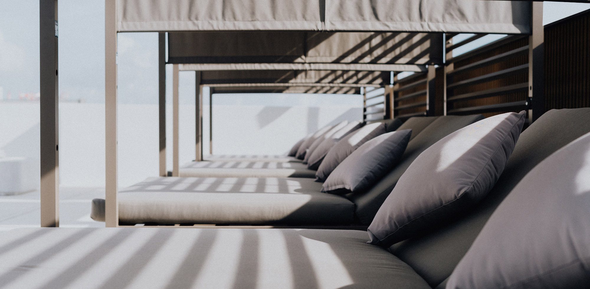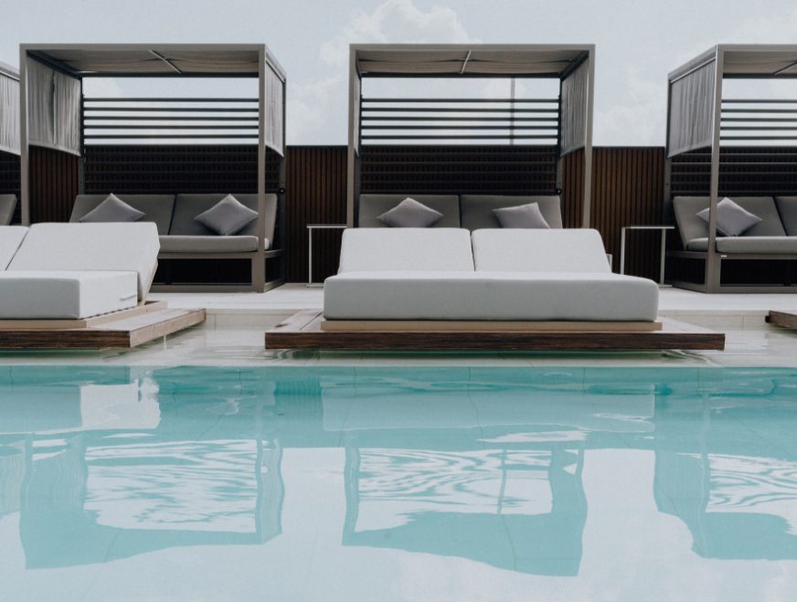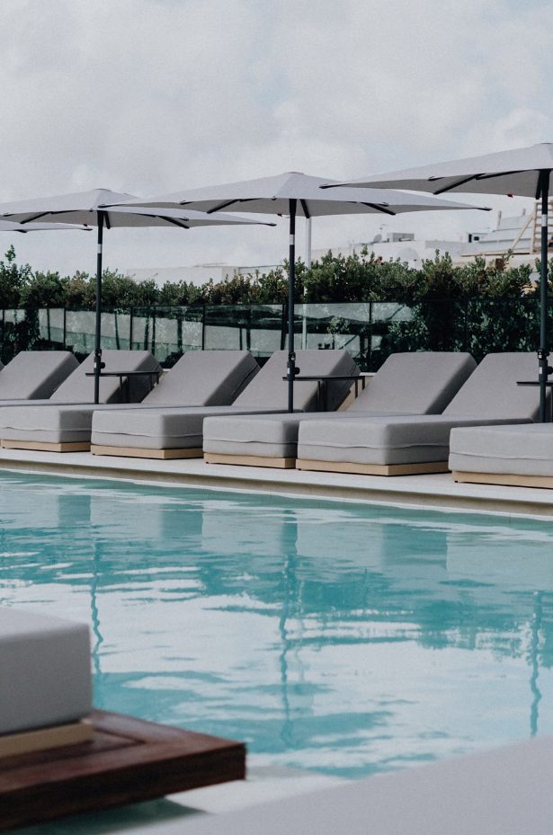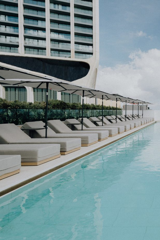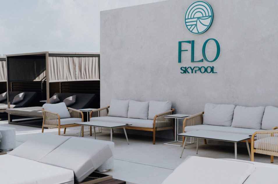 Attention to detail is evident in every aspect of Flo Skypool’s design. The incorporation of diverse textures and materials adds depth and character to the space. Wood and microcement are prominently featured, lending a rustic yet contemporary feel that is both luxurious and welcoming. The pool area is equipped with a variety of seating options designed for ultimate comfort and relaxation. Guests can choose from standard sunbeds, cushioned luxury sunbeds, daybeds and the exclusive floating sunbeds—a first for the island. These floating sunbeds are not only a unique attraction but also a testament to the local craftsmanship that is a hallmark of Flo Skypool. Made with precision, these sunbeds feature decking and bespoke side tables crafted from wood and covered in microcement. The tables, with their curved edges and integrated ice buckets, are designed to enhance the lounging experience, ensuring that guests can enjoy a chilled beverage while soaking up the sun.