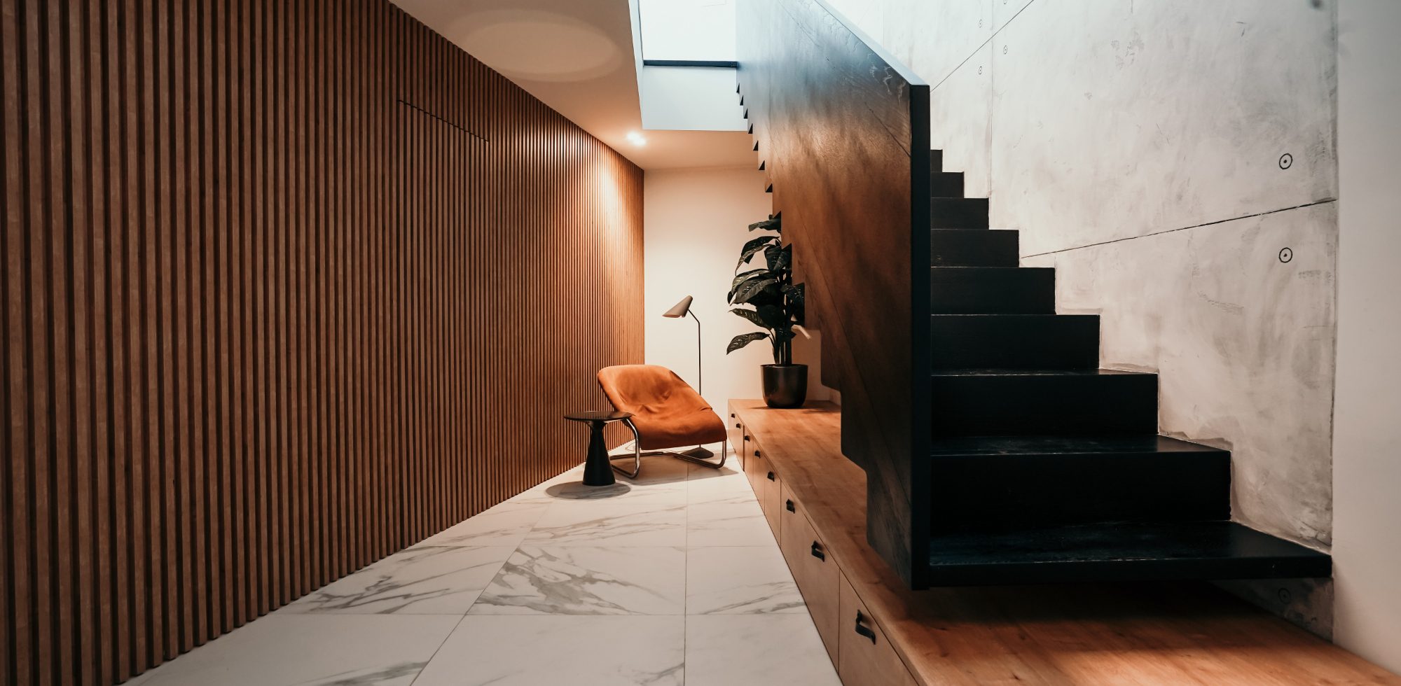 Whilst the space created by the new stairwell, divides the movement between the night and day area it serves as a dramatically architectural cross section linking the movement at the centre of the house and allowing natural light to penetrate the building through large glass openings.