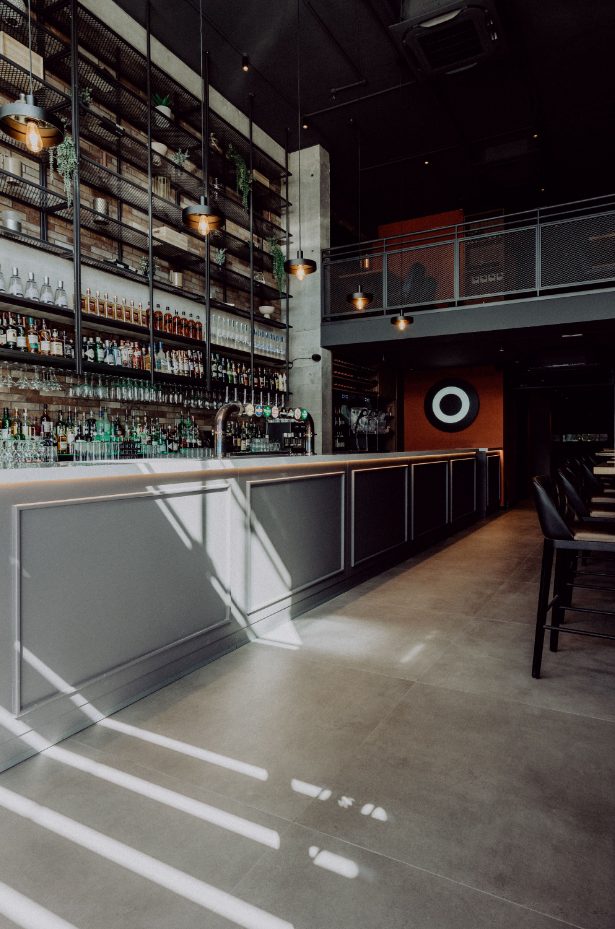 The entrance features an elongated bar area set in a double-volume space which creates a grand ingress inviting its guests. The general layout was focused on the users’ experience having the front area primarily based on the use of high tables which cater as a lounge area, while the back area and the mezzanine allow the visitors to have a cosier vibe to dine in.