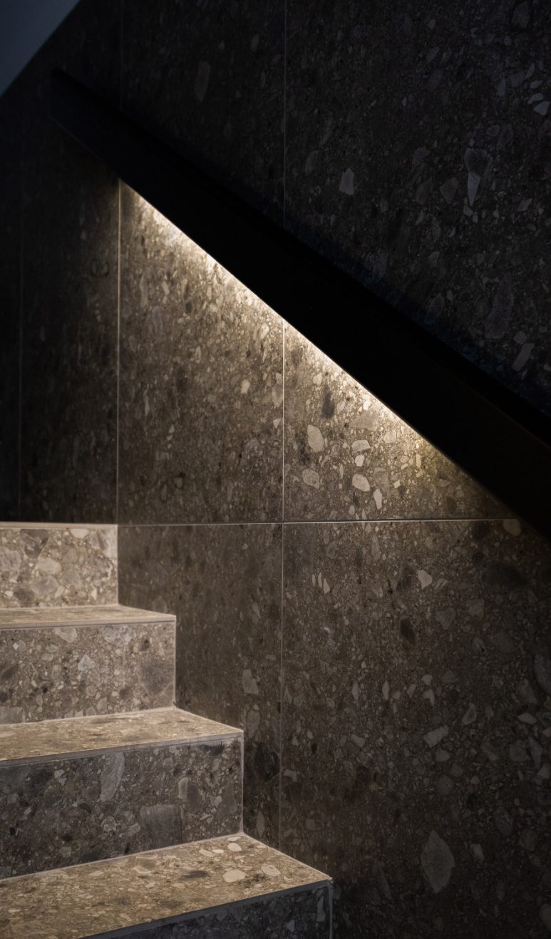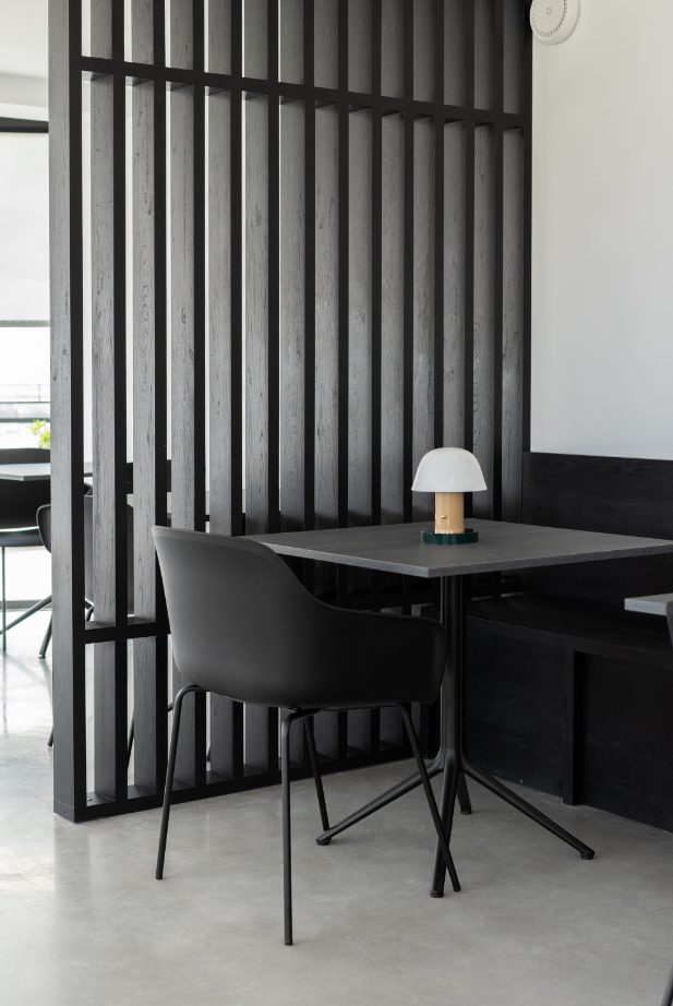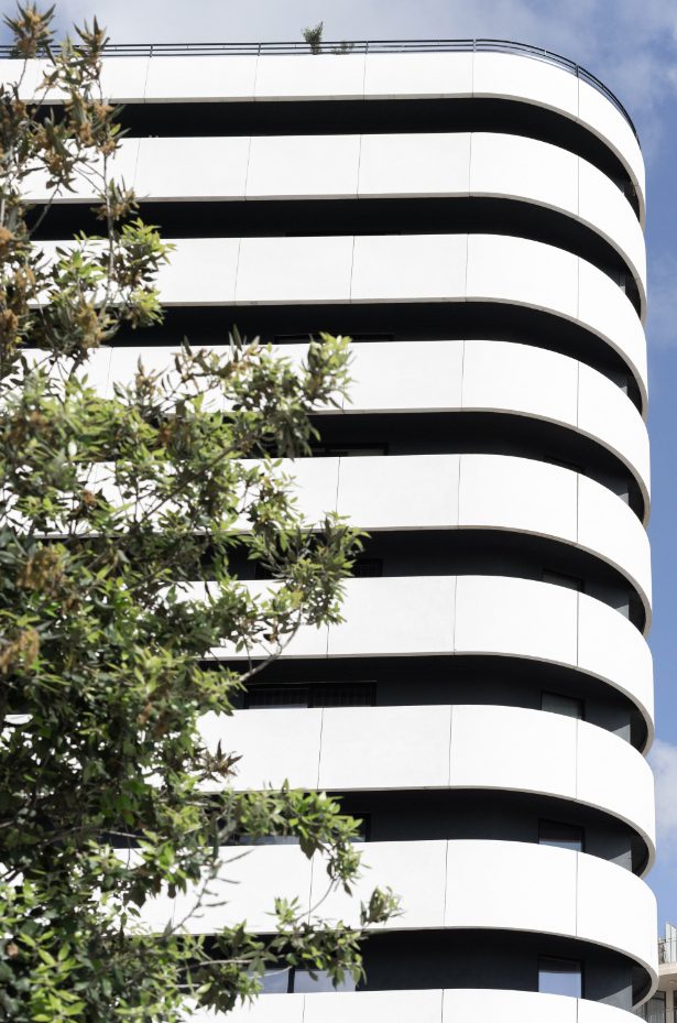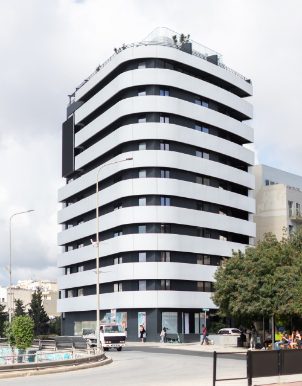 The exterior architecture of the corner building immediately catches the eye. Adorned with striking black and white stripes, the structure creates a visual illusion, appearing larger than its actual size. This optical playfulness pays homage to the Bauhaus movement while establishing the building as an iconic landmark within the area. The white precast panels that form the facade are suspended on a cantilevered terrace, adding an element of modernity and a sense of lightness to the structure.