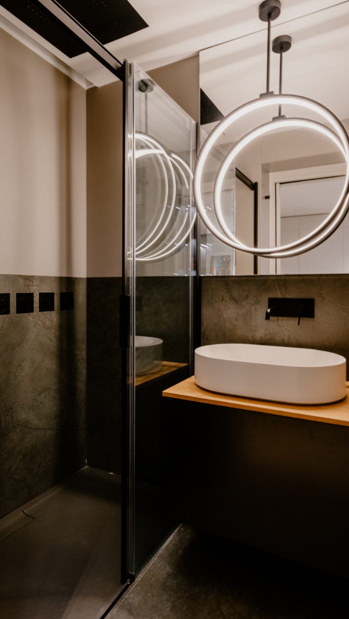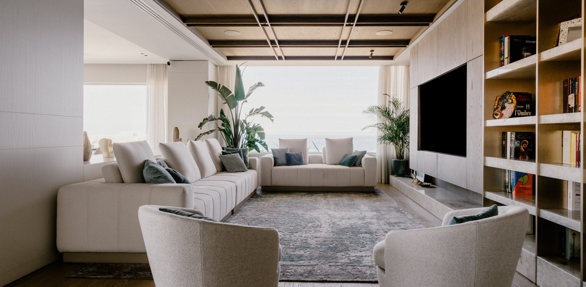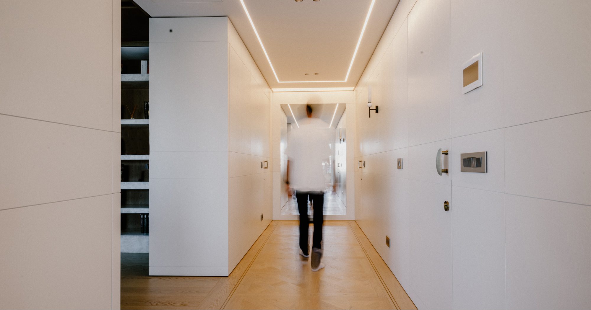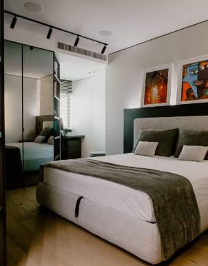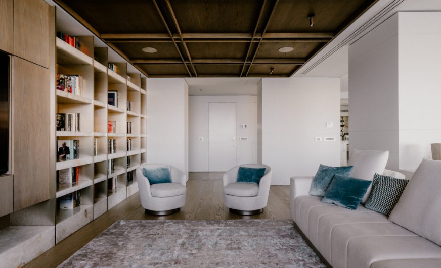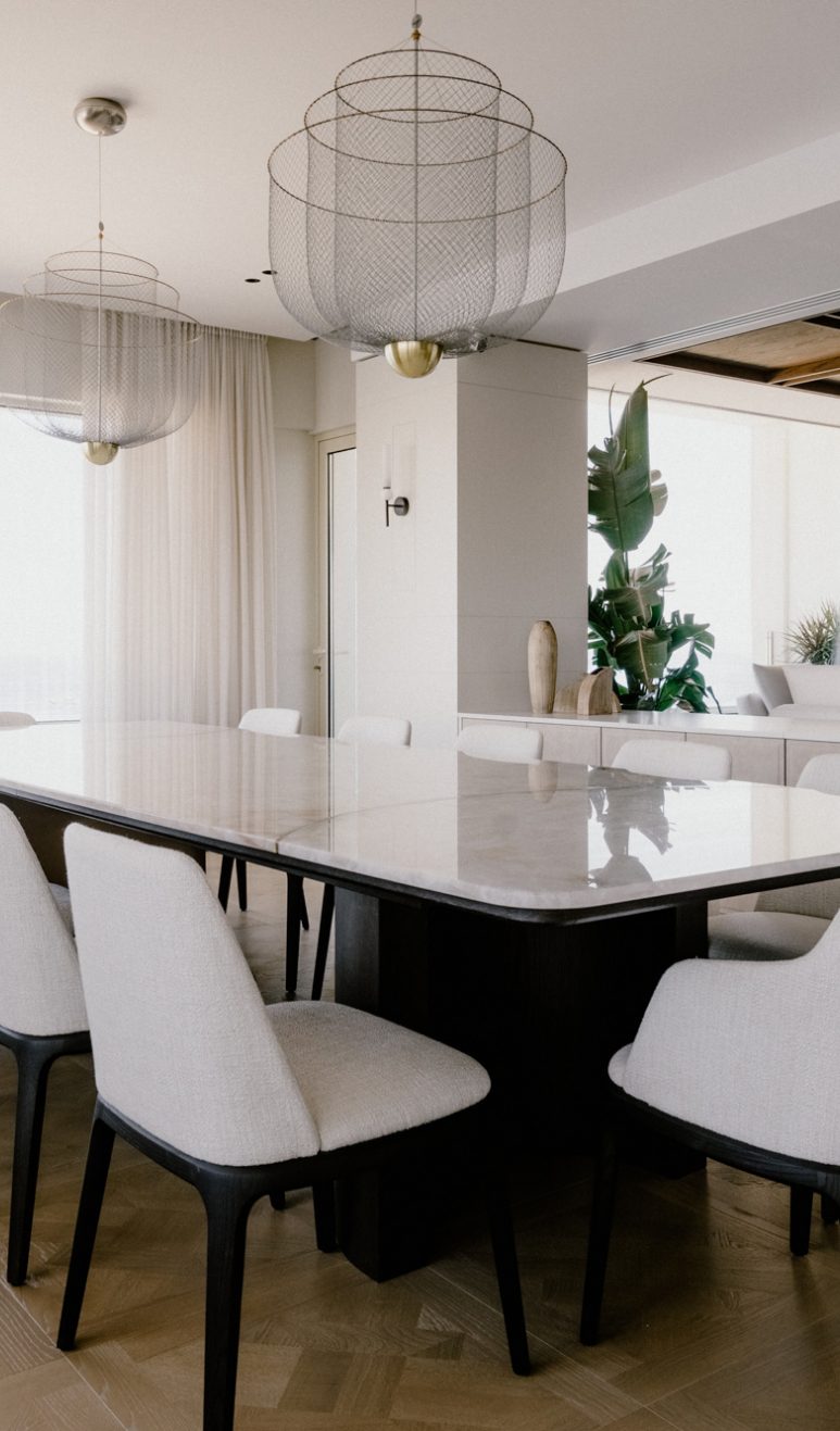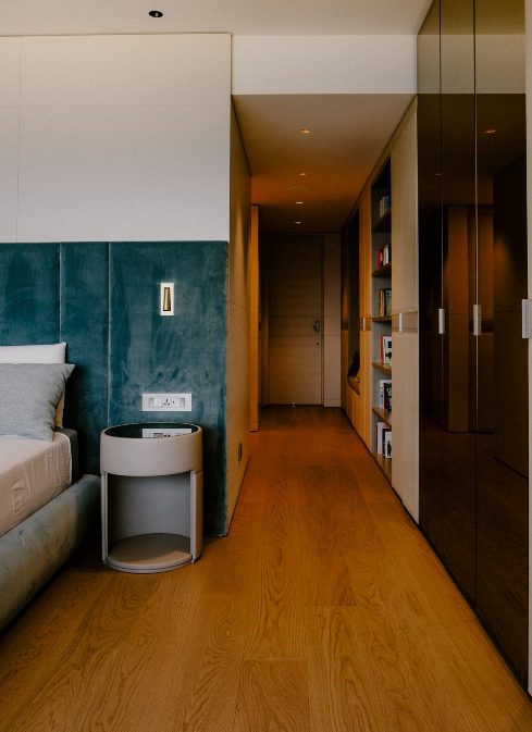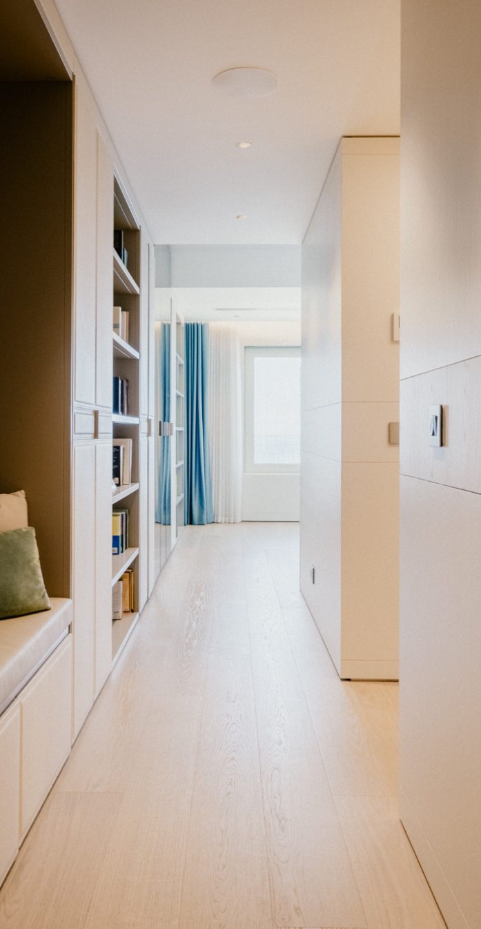 The interior of the apartment is a testament to exquisite craftsmanship and attention to detail. At first sight, the bespoke wood lining finishes in a subtle and sophisticated matt limed finish adorn the walls, creating an atmosphere of warmth and sophistication. The bespoke marble works throughout the space elevate the aesthetic, adding a touch of timeless class. Real wood flooring graces the floors, lending a sense of natural beauty to the living spaces.