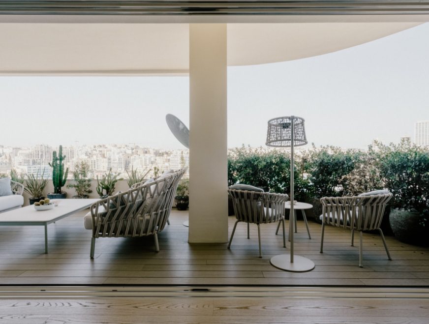The apartment’s layout has been altered with meticulous planning and structural works and today thoughtfully accommodate a private lift lobby entrance setting the tone for exclusivity. Upon entry a large hall with a picture panoramic sea view window captures the breath-taking Dragonara Casino Peninsula, inviting the beauty of the outdoors inside. The open space TV/living and dining area seamlessly transitions into a reading lounge and a separate bar and entertainment wine lounge, creating a harmonious flow between the open spaces. All these areas open up to a large corner outdoor terrace, where one can revel in the sea breeze and the scenic views in all privacy