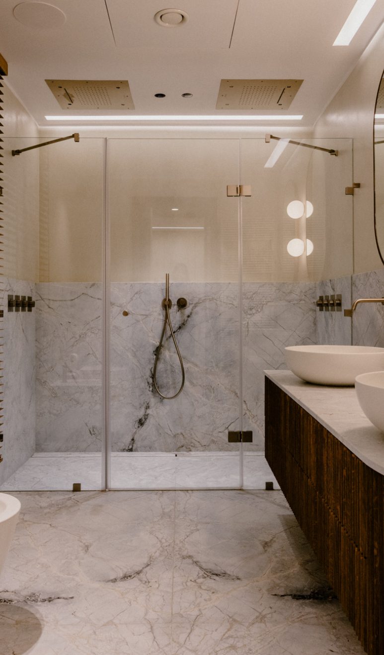 The remaining sleeping quarters are designed for utmost comfort and indulgence. A short corridor leads to night quarters where two more bedrooms are detailed on either side, one of which is the master suite. The master suite boasts a generously sized walk-in wardrobe, surpassing the ordinary and providing ample space for a curated his and hers space. The ensuite bathroom is a sanctuary of relaxation, featuring his and her walk-in sensory showers and a bespoke marble vanity, enhancing the bathing experience to a luxurious 5 star ritual.