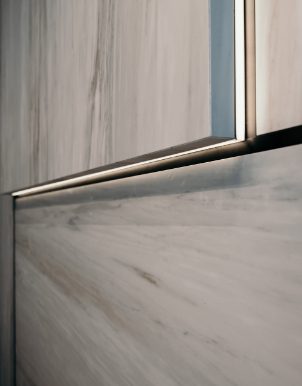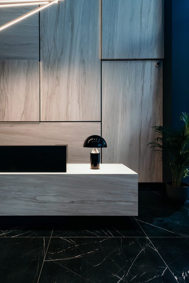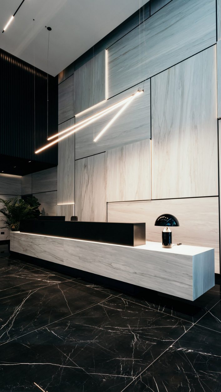 The double-height foyer features floor-to-ceiling light marble-effect tiles, framed with black metal profiles in a dynamic grid layout. Illuminated protruding volumes add depth, while glossy black flooring contrasts with the light walls for a dramatic effect. Modern armchairs with anthracite eco-leather upholstery enhance the contemporary aesthetic, creating a refined yet inviting ambiance.