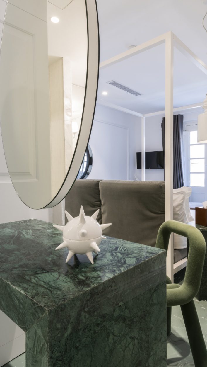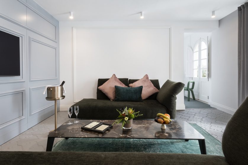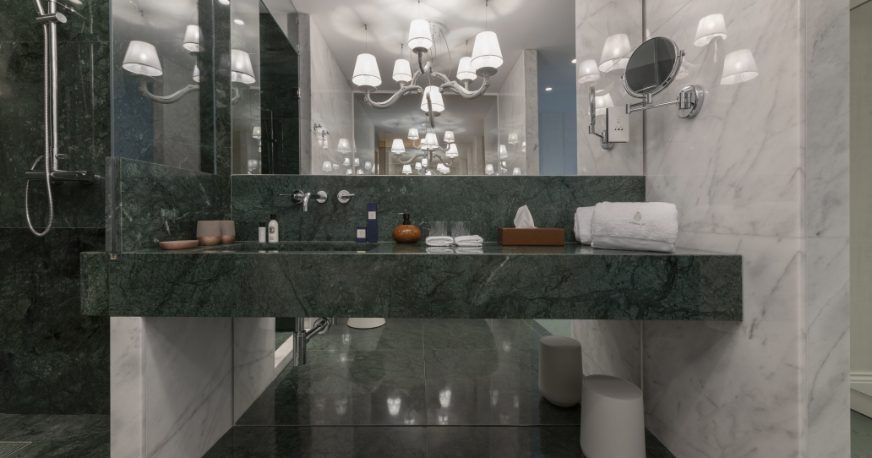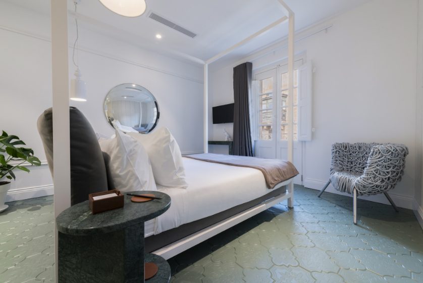 The Hideaway offers a bespoke guesthouse setting with two rooms and two suites. Spread over five floors, each room and suite are set on its own level and boasts beautiful design that perfectly blends history with romance. All rooms are enriched with luxurious fabrics and Ivanka concrete patterned tiles, while the open-concept bathrooms are finished in rich marbles. Custom designed wallpapers inspired by traditional Maltese tapestry pay tribute to the city’s rich heritage are instantly noticeable in every room. The Deluxe Suite enjoys breath-taking views from two restored balconies. It consists of a spacious living and dining area, as well as a custom-built kitchenette, a marble bathroom with a shower and a freestanding bathtub, and an overhand classic-inspired modern Karman chandelier. A minimalistic bedroom that features a contemporary four-poster bed adds to this theatrical setting. The rooftop terrace includes a plunge pool and alfresco private dining area overlooking the Grand Harbour offering one of the most exclusive and scenic outdoor spaces on the street.