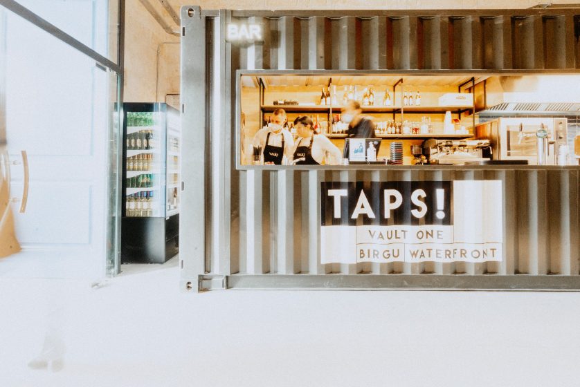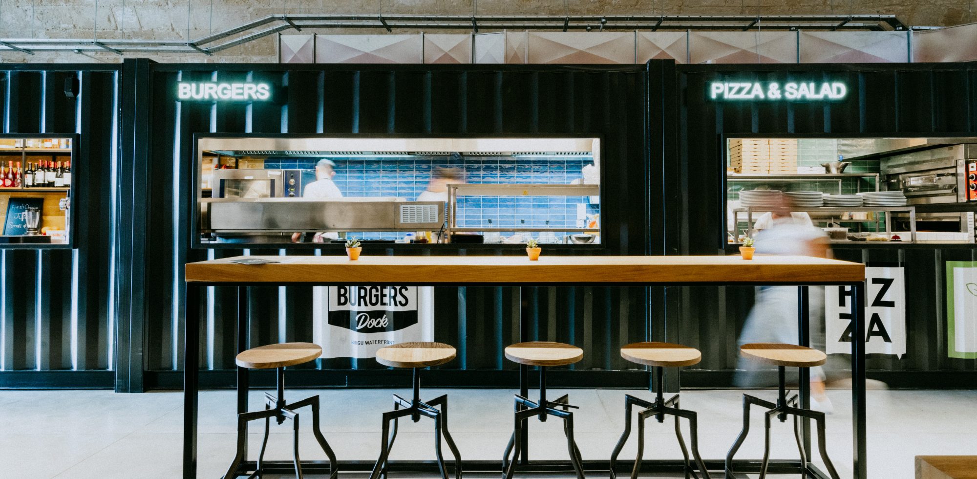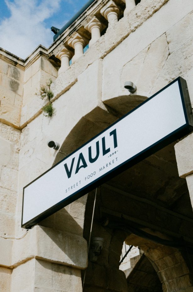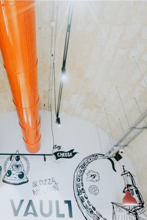 The design of the establishment was inspired from the original use of the vault which operated as a magazine for the Knights of St. John and the British Royal Army. A 40 feet shipping container took centre stage in the vault and serves as an open kitchen that serves various kinds of food, from pizza to salads. An industrial design look was kept throughout the space by using materials such as metals, raw wood, concrete, leathers and an exposed ceiling to show off the beautiful vaulted ceiling which originated in the 16th century. The colourful a/c duct and kitchen tiles combined with the big hand painted mural adds a nice pop and contrasts the otherwise minimal industrial design of this compact and versatile eatery.