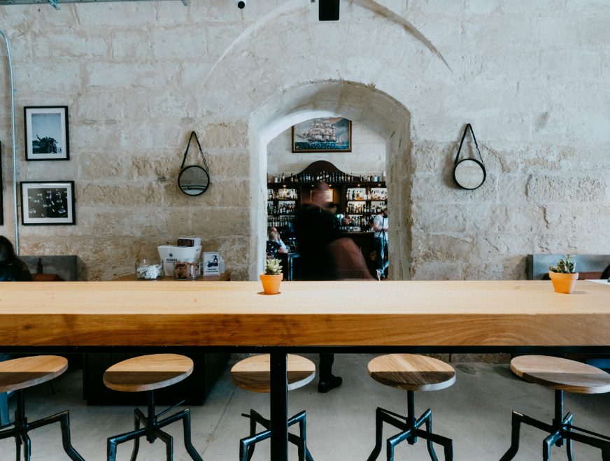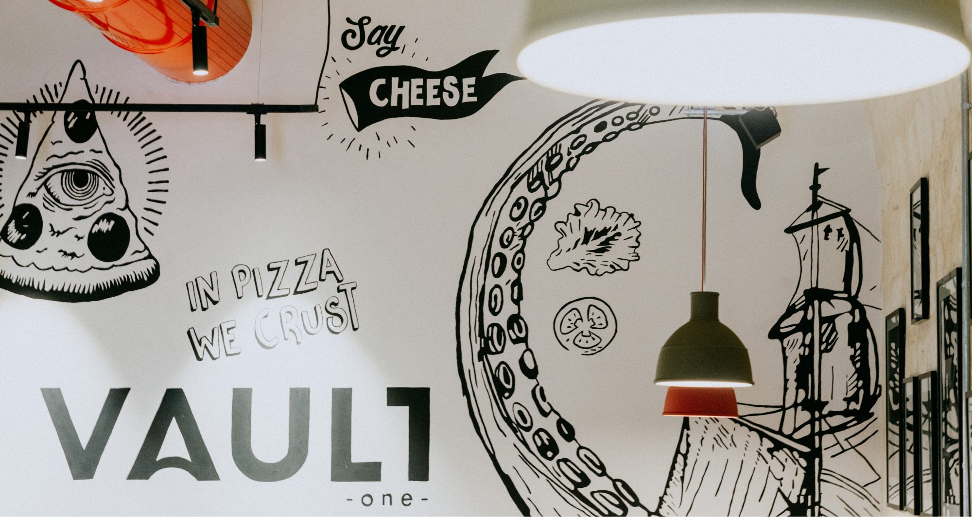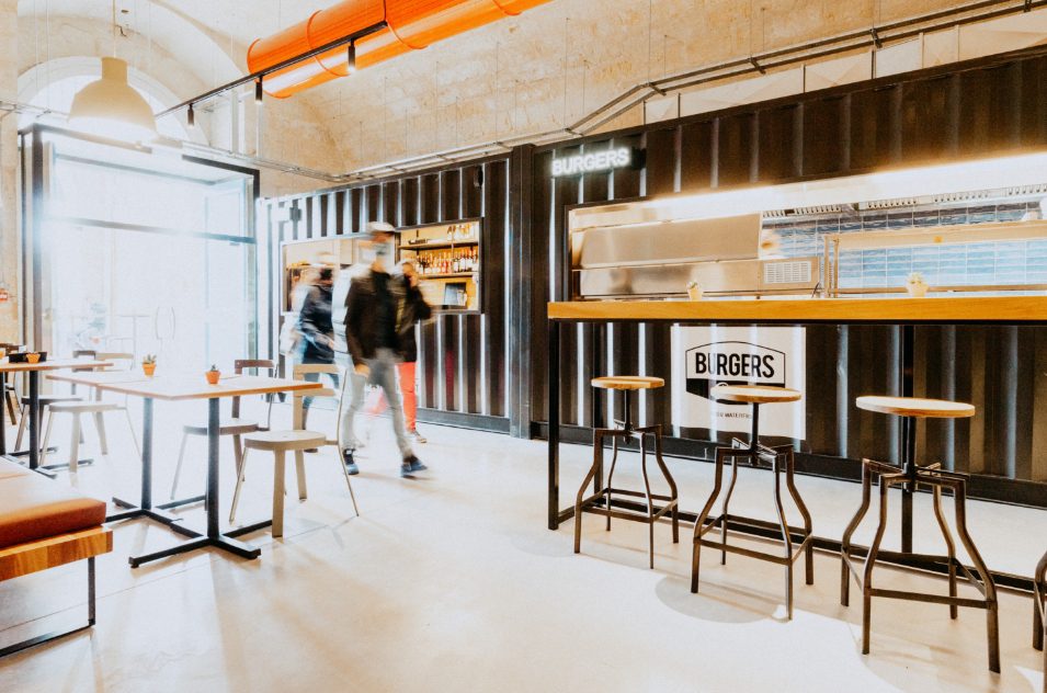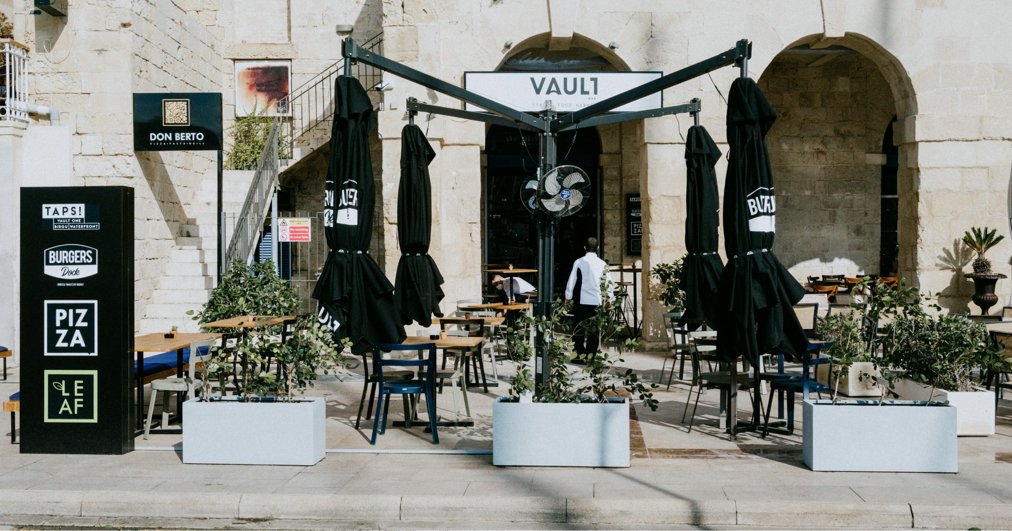 The design of the establishment was inspired from the original use of the vault which operated as a magazine for the Knights of St. John and the British Royal Army. A 40 feet shipping container took centre stage in the vault and serves as an open kitchen that serves various kinds of food, from pizza to salads. An industrial design look was kept throughout the space by using materials such as metals, raw wood, concrete, leathers and an exposed ceiling to show off the beautiful vaulted ceiling which originated in the 16th century. The colourful a/c duct and kitchen tiles combined with the big hand painted mural adds a nice pop and contrasts the otherwise minimal industrial design of this compact and versatile eatery.