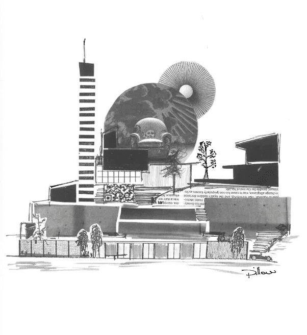 II collage in bianco e nero intitolato Mashup Architecture, realizzato dal fondatore e direttore creativo di DAAA Haus – Keith Pillow, esprime chiaramente la sua visione dell’architettura futura. Pillow riflette sulla realta di un mondo gia ampiamente costruito, dove diffi.cilmente ci sara un rifacimento totale e si continuera a costruire nuovi edifici mescolati ai vecchi, senza confini culturali o geografici. Gli architetti dovranno trovare spazio per sovrapporre nuove strutture, mixando stili, scopi e forme. In un’utoplca visione romantica la verita sarebbe diversa, ma la realta mostrera un oriente che diventa occidente, templi antichi accanto a grattacieli, stile liberty unito al modernismo, e dove anche il brutalismo evochera nostalgia. Mashup Architecture rappresenta la probabile e sfortunata verita dell’architettura futura, dove tutto si mescolera in modo infestante.